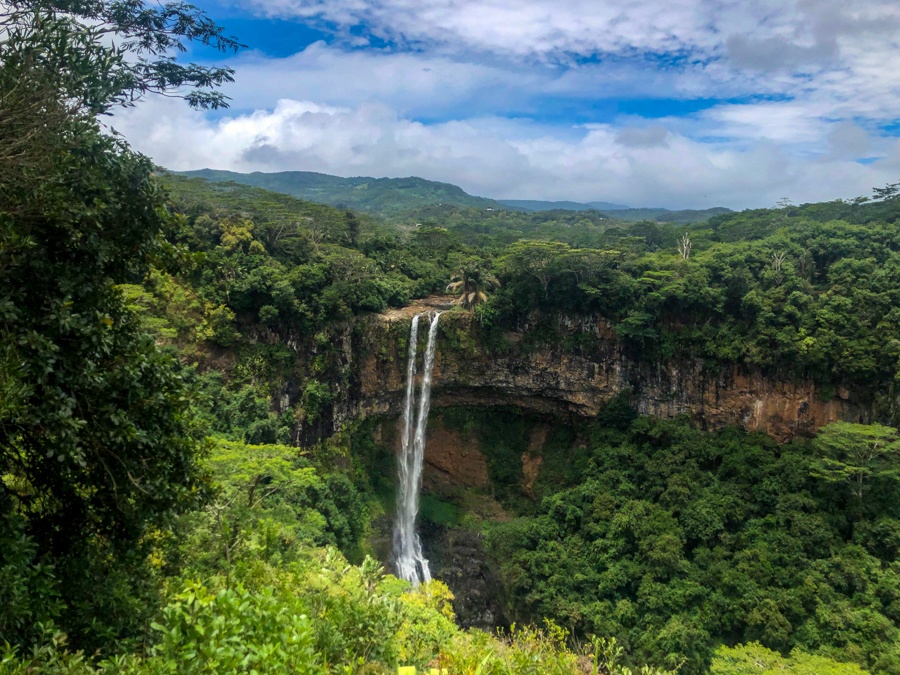 Touren neigen dazu, zuerst zum Chamarel -Wasserfall zu fahren, ein großer und mächtiger Wasserfall, der von üppigen grünen Wäldern umgeben ist.
